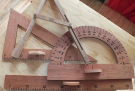 Conjunto de 4 instrumentos de medición para realizar demostraciones en la pizarra. Consta de una regla de 70 cm, una escuadra de 90º-60º-30º, un transportador y un compás.