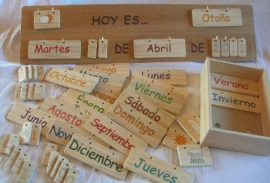 Panel de madera nativa con letreros, para poner la fecha en la sala de clases. En idioma mapuzungun