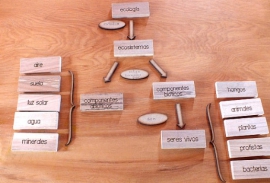 Set de fichas de madera con conceptos e ilustraciones que permiten a los niños elaborar esquemas y mapas relacionados con la Ecología, como cadenas alimenticias.