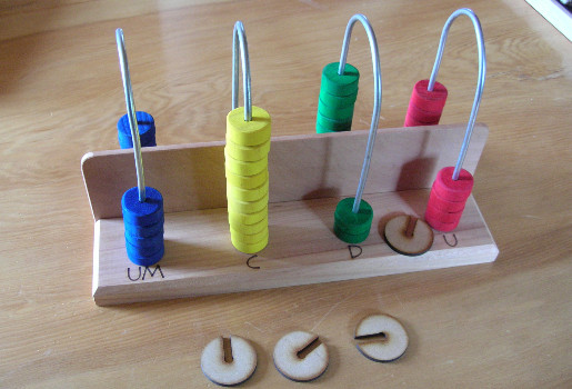 Ábaco posicional con unidades de mil, elaborado en madera de pino teñida con cuatro colores.