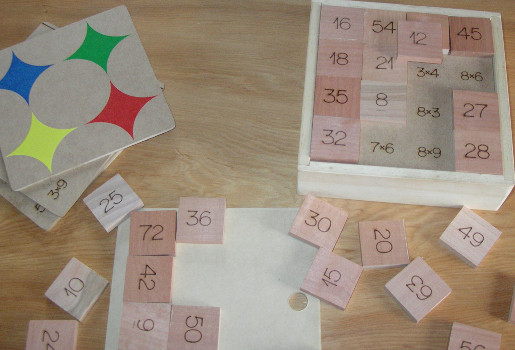 El niño debe colocar las fichas con los resultados sobre las multiplicaciones del tablero, de modo que el conjunto de fichas por el reverso forma el diseño del tablero (si las operaciones se hicieron correctamente).