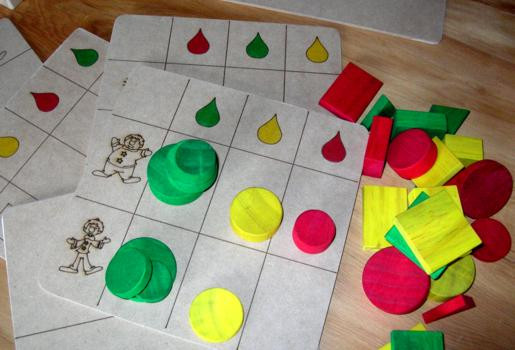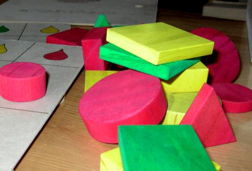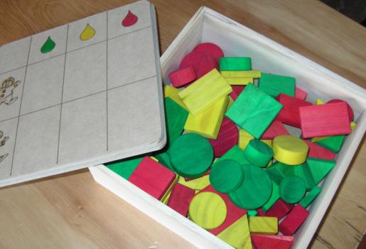 Las piezas son de madera de pino teñida. Las gruesas tienen un espesor de 18 mm, mientras que las delgadas tienen un espesor de 9 mm. Por su parte, las cuadrados grande tienen un lado de 53 mm, los medianos de 43 mm y los pequeños de 33 mm. Las medidas del resto de las formas son proporcionales a las indicadas para el cuadrado.