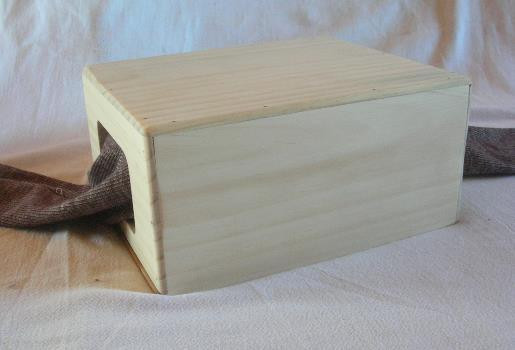 Caja de madera cerrada, con aberturas y mangas de género en dos lados, para que el niño meta las manos y descubra sólo con el tacto lo que hay adentro.