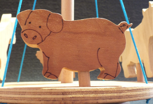 Carrusel de madera con cuatro animales de granja, que gira y se mantiene girando por inercia.