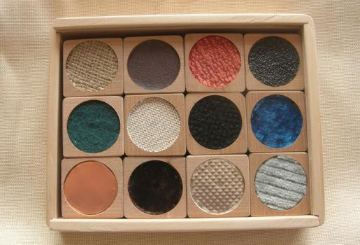 Juego de 24 fichas de madera nativa con 12 materiales diferentes en textura, rugosidad, temperatura, color, dureza, etc.