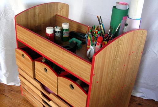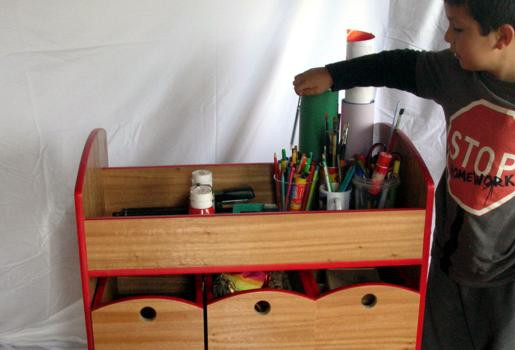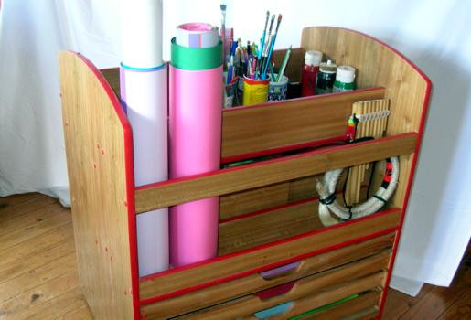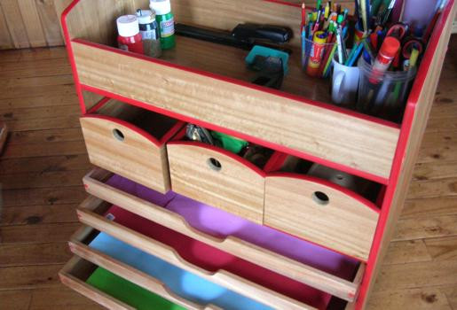 Cuenta con 3 cajones para materiales pequeños o a granel, 4 bandejas para mantener estiradas cartulinas y papeles, un sector para rollos o materiales alargados y una superficie plana superior para almacenar resmas en uso y contenedores de lápices, pinceles, témperas y demás.